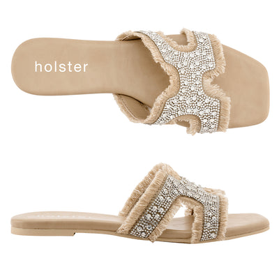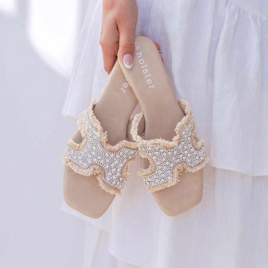 Regular price $109.99Slide into laid-back luxury with Vibe. From sandy sunsets to moonlit strolls, this chic slide brings effortless glamour to coastal nights. Soft frayed edges, a hint of jewel shine, and easy comfort make it perfect for slipping on as the boardwalk lights up and the evening breeze rolls in.